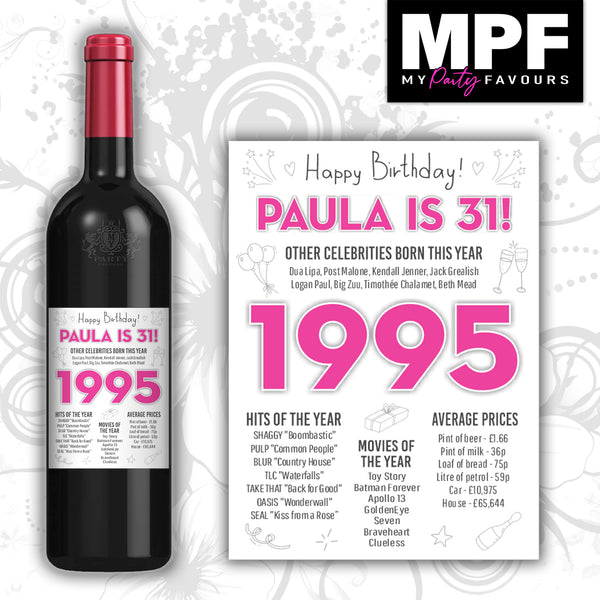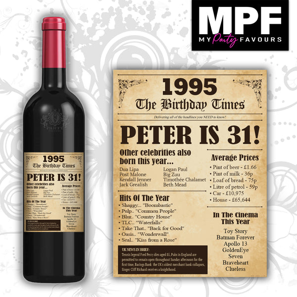 Personalised 1995 31st Birthday Wine Gin Vodka Bottle Label - Newspaper - Party