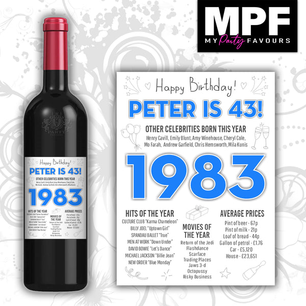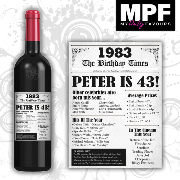 Personalised 1983 43rd Birthday Wine Gin Vodka Bottle Label - Newspaper - Party