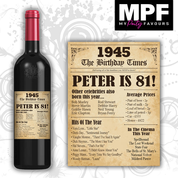 Personalised 1945 81st Birthday Wine Gin Vodka Bottle Label - Newspaper - Party