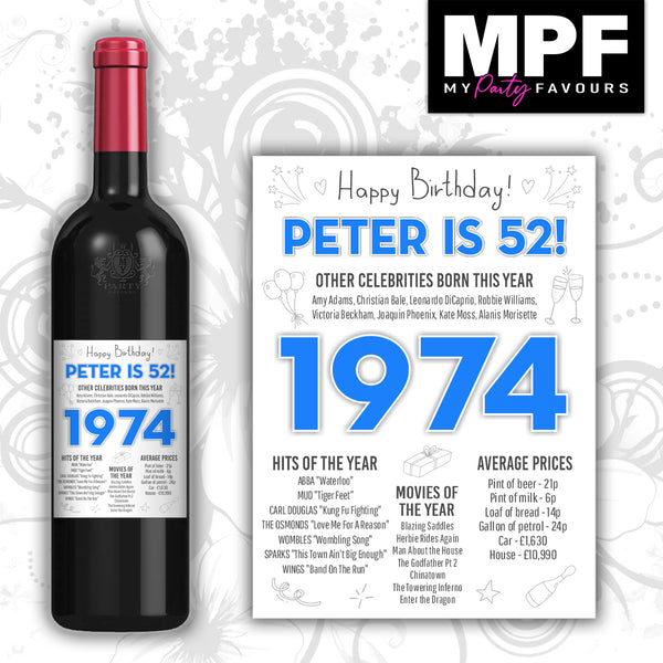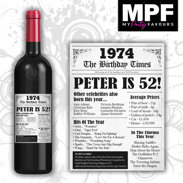 Personalised 1974 52nd Birthday Wine Gin Vodka Bottle Label - Newspaper - Party